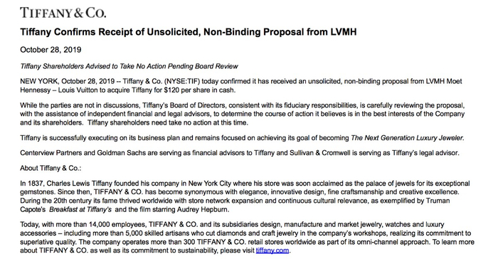 值得注意的是,有关这桩收购的消息早在上个月就已传到市场。当地时间10月28日,蒂芙尼在官方网站证实,收到了来自LVMH集团的一份未经请求的非约束性要约,以每股120美元的价格收购蒂芙尼。