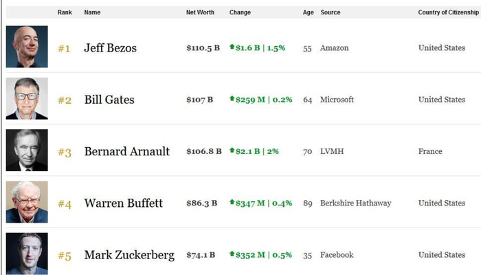 根据《福布斯》杂志的实时数据,阿尔诺的财富在一天之内增加21亿美元,至1068亿美元,在全球富豪榜上坐稳第三的位置,紧逼亚马逊老板贝佐斯(1105亿美元)和微软创始人盖茨(1070亿美元)。