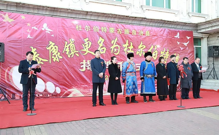 11月25日,泰康镇更名杜尔伯特镇揭牌仪式举行。 “今日杜尔伯特”微信公众号 图