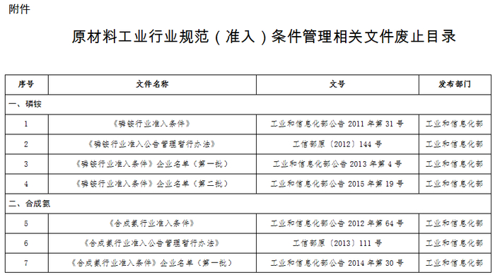 为贯彻落实党中央、国务院关于转变政府职能和深化“放管服”改革的精神,经研究,我部决定自公告发布之日起废止《磷铵行业准入条件》(工业和信息化部公告2011年第31号)、《合成氨行业准入条件》(工业和信息化部公告2012年第64号)、《电石行业准入条件》(工业和信息化部公告2014年第8号)等26个原材料工业行业规范(准入)条件管理相关文件(详见附件)。
