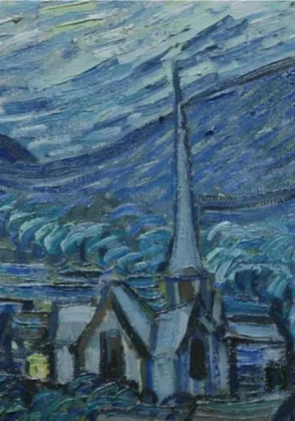 星空是炽烈的,似乎被点燃了。而星空下宁静的村庄是基于梵高的想象,或思念——那带有尖顶的教堂很有可能来自梵高的家乡荷兰。