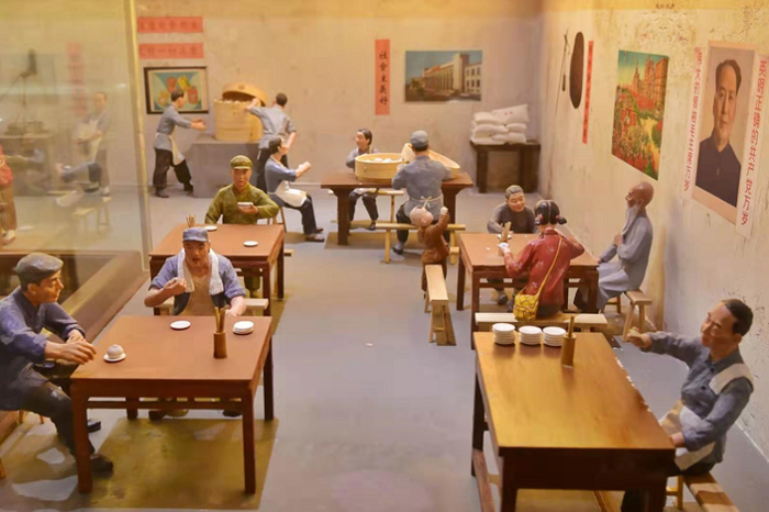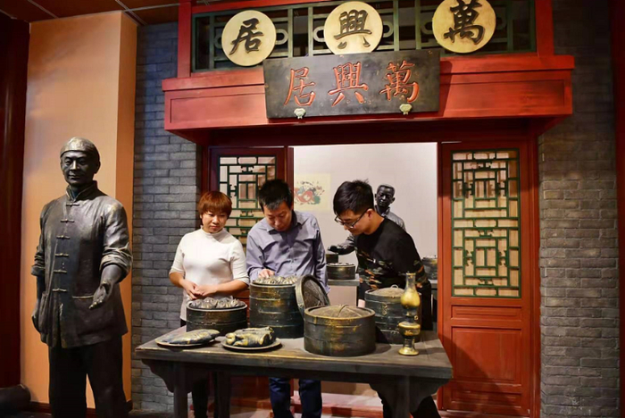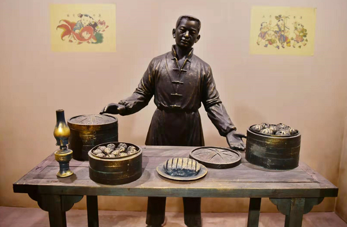 第二展室里等比例还原出老铺子门脸前店门口伙计招揽生意的情景,旁边的西单北大街上,泥捏的小人儿有的在铺子前卖包子,有的挑着一担兔儿爷叫卖,还有食客坐在餐桌前吃包子的热闹场景,老北京街景栩栩如生。