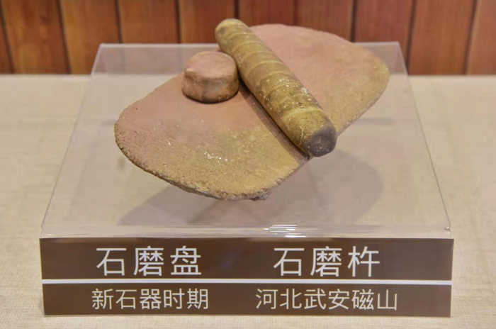 文化展馆里还展示出整个五谷面食和馅料文化的起源。从钻木取火的人物雕塑、新石器时代磨面粉用的小石块和小磨盘,到古时候的农用锄头、石耜、青铜犁铧,中华文明从刀耕火种到食不厌精的发展历程全在这儿展现出来。