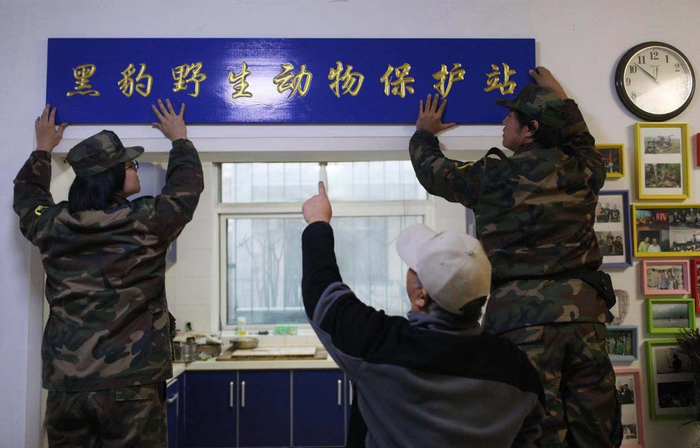 黑豹野生动物保护站成立即将满二十年,李理的父亲指挥儿子换上正式的牌匾。