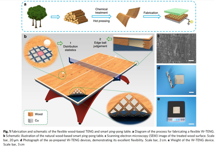 木质摩擦纳米发电机(W-TENG)和智能乒乓球桌示意图
