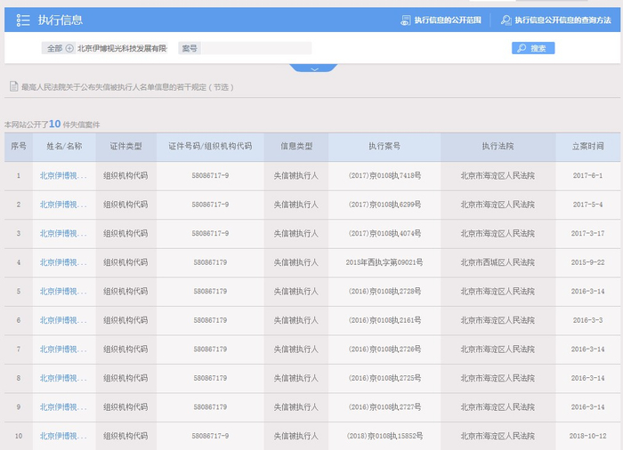 在北京法院审判信息网执行信息中查询,伊博公司自2105年至去年,已经10次被海淀和西城法院列为“失信被执行人”,并且全部未履行,其中,也有其他案件是消费者向该公司追索赔偿。