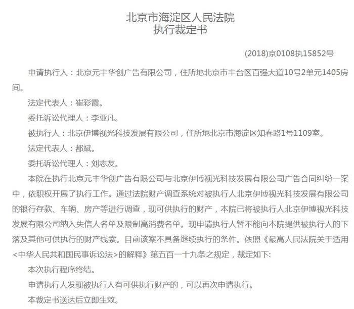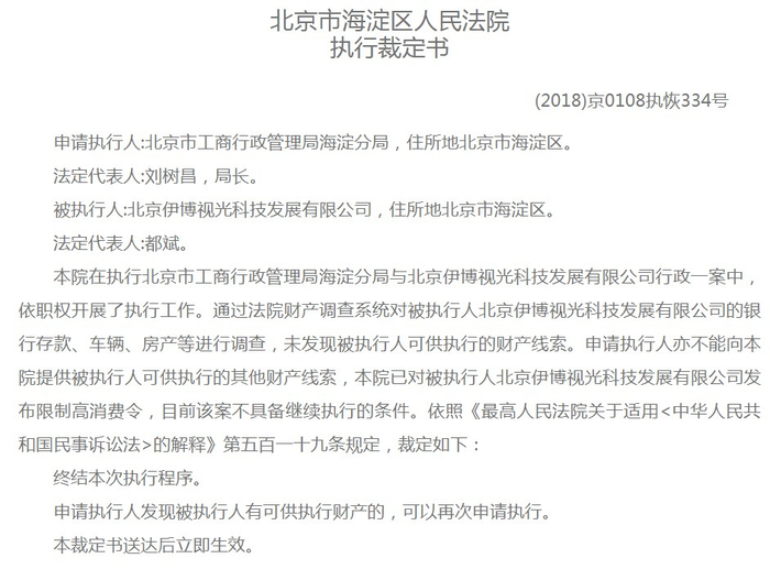 对多起案件,海淀法院也已经发出执行裁定书:通过法院财产调查系统对被执行人北京伊博视光科技发展有限公司的银行存款、车辆、房产等进行调查,未发现被执行人可供执行的财产线索。申请执行人亦不能向本院提供被执行人可供执行的其他财产线索,本院已对被执行人北京伊博视光科技发展有限公司发布限制高消费令,目前该案不具备继续执行的条件。