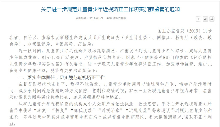 同时,该通知还规定,从事儿童青少年近视矫正的机构或个人必须严格依法执业、依法经营,不得在开展近视矫正对外宣传中使用“康复”“恢复”“降低度数”“近视治愈”“近视克星”等表述误导近视儿童青少年和家长。不得违反中医药法规定冒用中医药名义或者假借中医药理论、技术欺骗消费者,谋取不正当利益。