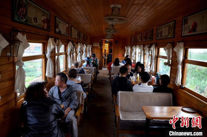 图为游客在一辆停用多年的米轨小火车前拍照。 缪超 摄