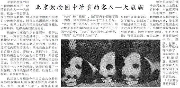 1955年,北京动物园里迎来3位珍贵的客人——大熊猫。当年7月2日,北京动物园在国内首展大熊猫。大熊猫畏暑怕寒,食性特别,人工饲养极为不易,至于在人工饲养条件下繁殖后代。