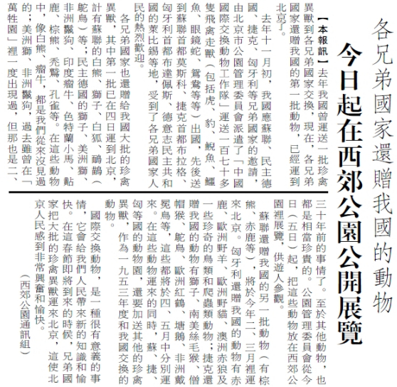 兄弟国家还赠给我国大批珍禽异兽,第一批在1953年2月4日运到北京,第二天起就在西郊公园里展览。这批动物共有10余种48只,其中白熊、白狐、美洲狮等均为国内首次饲养展出。