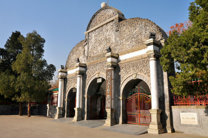 北京动物园造型独特的砖灰色“三拱门”。冯文冈/摄