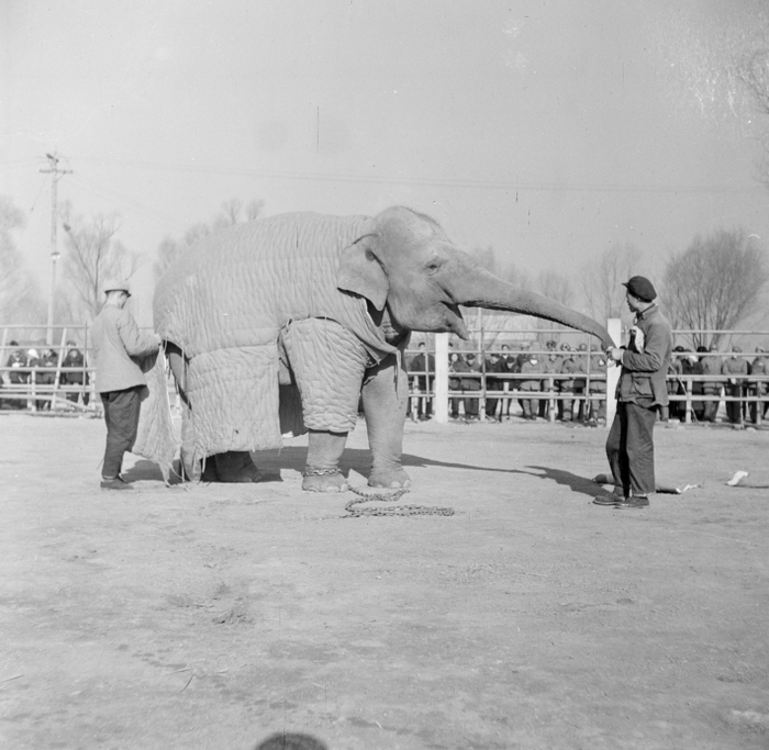 为帮大象御寒,1956年冬天,动物园给大象穿上了棉衣。曹尔泗/摄