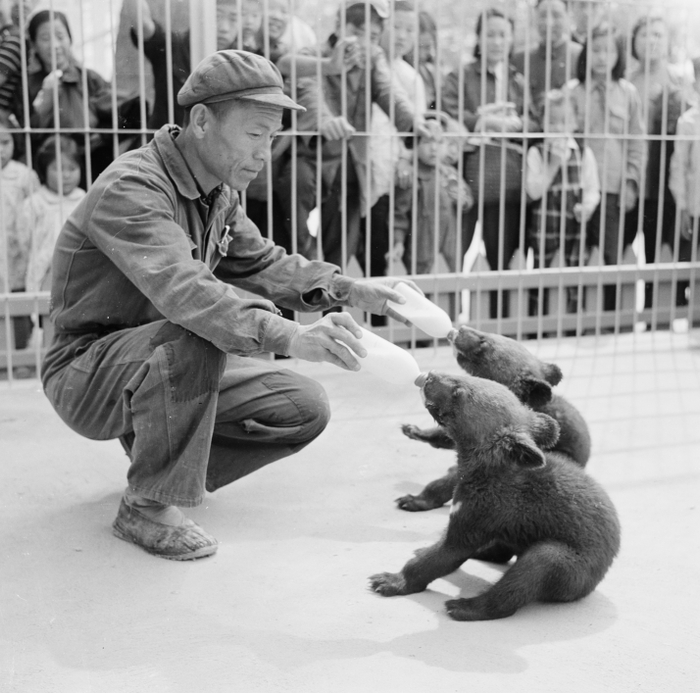 1954年,饲养员正在给小黑熊吃牛奶。李祖慧/摄