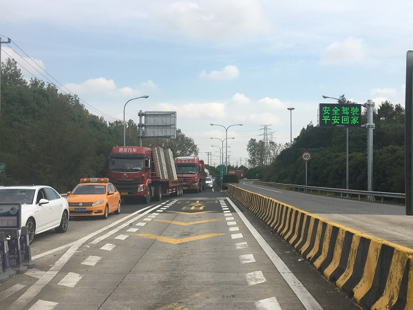 另外,交警部门在实地调研后,发现该出口拥堵的主要原因是下匝道只有一根行车道,车流高峰时人工、ETC收费车辆混行,通行效率极低,有时收费口前800米的距离需要耗时近15分钟。据此,交警支队会同相关部门利用匝道内硬路肩,重新漆划标线,把原来的一根车道增拓为二根车道,同时增加4块“ETC车辆靠左,人工车辆靠右”警示标志,地面标注“ETC”“人工”字样,确保车辆各行其道,大幅提升了通行效率。