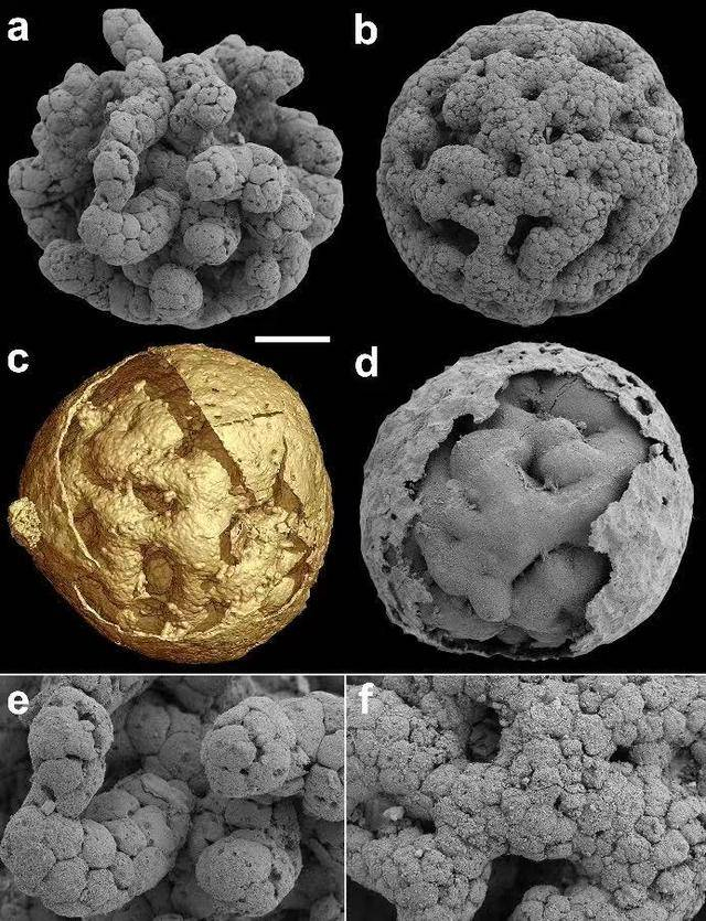 而吸引科学家注意是,是笼脊球精美的多细胞结构。“外面是一个完整的囊包,有两层包膜,内层的膜较薄,外层膜较厚,里面是一个多细胞体。”殷宗军说,研究发现它们在一个充满母源营养物质的厚壁囊包中发育,不同标本代表了不同的发育阶段。他们从中空的笼状逐渐发育成实心球。
