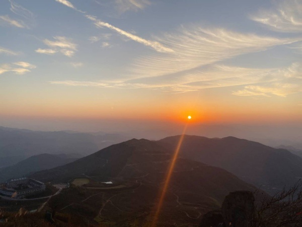 覆卮谐音福祉、福至,因而也成为游客前来祈福的江南名山。从山脚向上,一路走走停停,一个半小时登顶。山顶有一块“福祉石”,还有一个小亭曰“福祉亭”,寓意深长,既供人栖息,也可以远观看山景。覆卮山顶的一场日落,是馈赠给不辞辛劳登顶者的一份绝美礼物,落日余晖洒在连绵群山之上,或许谢灵运当年正是被这番美景感染,在此“饮酒赋诗,饮罢覆卮”。