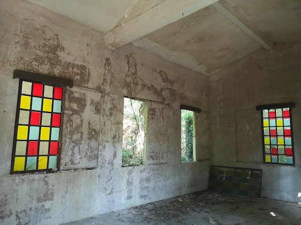 如今,风水林簇拥的南塘学校已荒废多年。沿着石阶走上斜坡,只见两扇大木门敞开,均已残破不堪,外墙玻璃也多已破碎。沿正门走进去,杂草丛生,将整个天井覆盖。回廊结构将一间间教室连接在一起,正中的礼堂还有一个舞台,两侧是建校碑记。