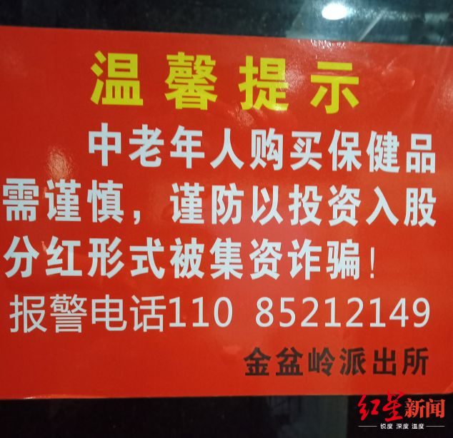 大厦一楼电梯口,贴有金盆岭派出所的温馨提示:“谨防以投资入股分红形式被集资诈骗”,旁边是报警电话。