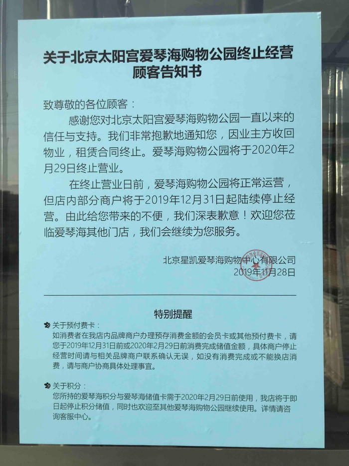 官宣!太阳宫爱琴海购物公园明年2月底停业
