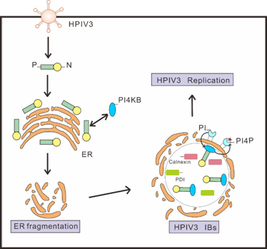 在前期工作的基础上,陈明周团队在Cell Reports以长文(Article)形式发表论文,揭示负链RNA病毒利用内膜系统形成复制位点,并招募PI4K激酶形成富含PI4P的膜脂环境,促进病毒复制。人副流感病毒使内质网碎片化,并利用内质网组分形成包涵体,碎片化的内质网围绕在包涵体周围保护其组分不被消化,保证病毒复制的有效进行。另外病毒P蛋白招募细胞因子PI4KB到包涵体上,形成富含PI4P的膜脂环境,有效促进病毒的复制,进一步澄清了包涵体发挥功能的分子机制。最后,团队还分析了其他负链RNA病毒包涵体与PI4K的关系,发现HRSV利用核衣壳蛋白(nucleoprotein,N)将PI4KB招募到包涵体中生成PI4P,其包涵体也利用了内质网成分。