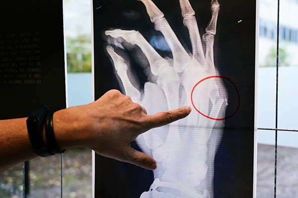 展览中展示的12张X光片令人震撼:包括鼻梁断裂、手腕被打碎、手指骨压伤、胫骨或肋骨裂成两半等,而最具震撼性的一张X光片是其中一名女病人的腹部被一把刀插着。