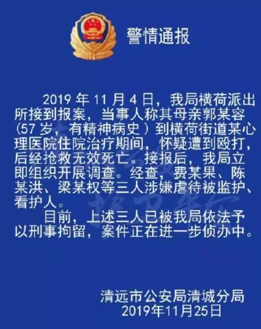 11月4日,广东省清远市警方接获报案,报案人陈先生称其母亲郭某容(有精神病史)在某心理医院住院期间,怀疑遭到殴打,后经抢救无效死亡。