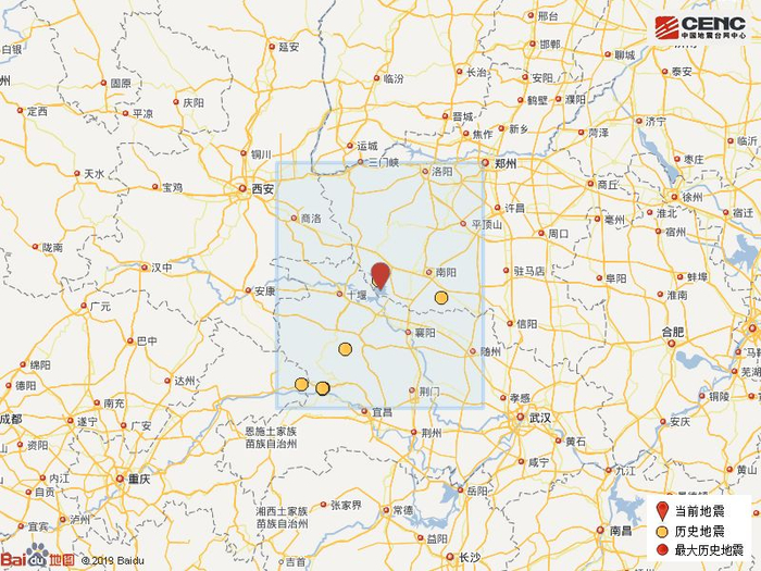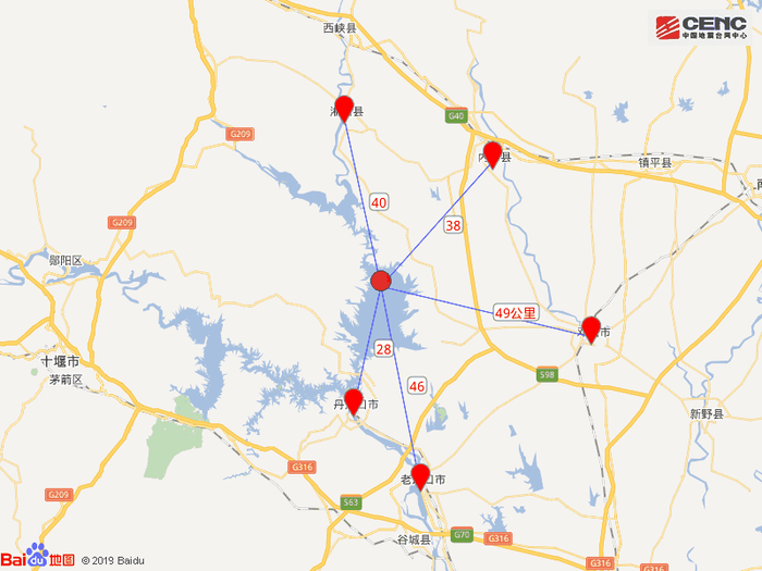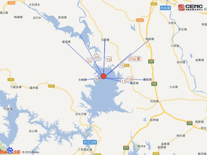 周边县城:震中距湖北丹江口市28公里、距内乡县38公里、距淅川县40公里、距湖北老河口市46公里、距邓州市49公里,距湖北十堰市75公里,距西安市294公里。