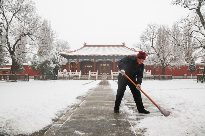 雪后,景山寿皇殿区域银装素裹,红墙金瓦白雪交相辉映。公园职工清理出游览路线,保留路边积雪,方便市民赏雪。