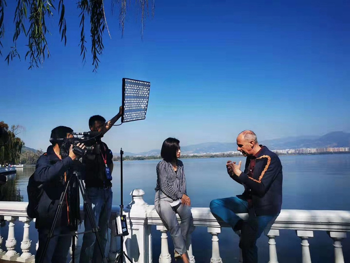 戏剧节发起人之一、英国Young Vic剧场总监提姆·亚当在邛海边接受采访