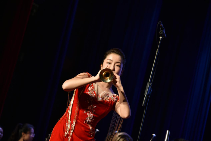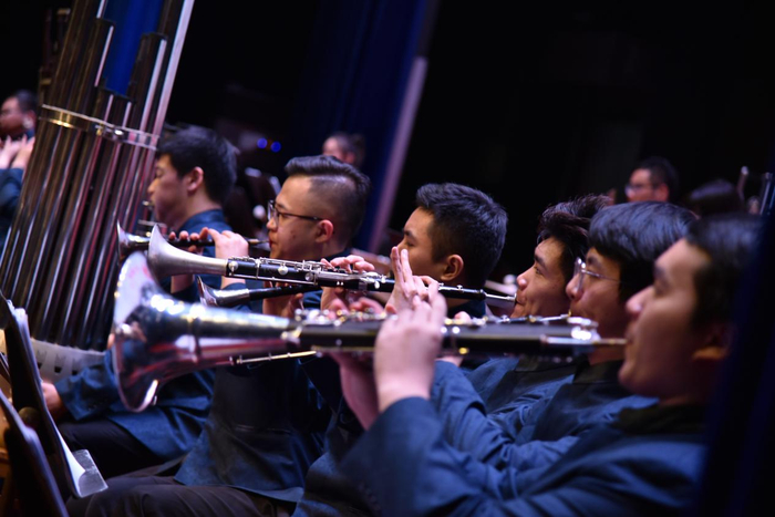 第二幕演奏的乐曲则更富多元文化色彩和地方特色,以《龟兹盛歌》为始。龟兹乐舞是丝绸之路上多元文化汇集中的一颗璀璨明珠,它对世界音乐文化的影响极其深远。这首曲子选用《瑞鹧鸪》片段为主要音乐素材,表达出乐舞相伴、盛世放歌的宏大景和豪情。紧接着一首赞颂华夏先民,展现美丽文化意象,《百鸟朝凤》用热情欢快的旋律描绘了百鸟和鸣之声,表现了生机勃勃的大自然景象。上海音乐学院刘雯雯老师用唢呐短促的吐音和高尖的滑音,极富技巧地模仿了“群鸟齐鸣,凤凰高飞”的意境,长音技巧的华彩乐句赢得了全场师生的热烈掌声。蝉鸣一段中,伴奏音乐突然停止,唢呐运用忽强忽弱的力度变化和循环换气的长音演奏,让人仿佛置身夏夜、回味无穷。随后,美声作品《英雄颂歌》、管弦乐《延河随想》又将观众带入那个延河滚滚、宝塔巍巍的年代情境,热情讴歌了永不褪色的延安精神,表达了对英雄儿女的赞美。