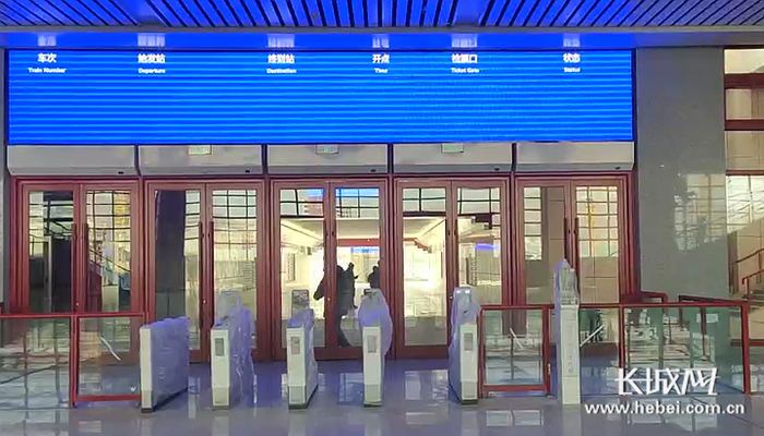 与扑面而来的古风相融的,是宣化北站毫无违和感的现代车站风貌。电子显示屏设置在一楼候车大厅正前方,站房正式投入使用后电子屏上将显示车次、始发站、终点站、开点、日期和余票更新情况。检票口处具备人脸识别功能的闸门已安装完毕,旅客进站乘车时面向闸机摄像头,刷身份证或者乘车二维码,即可“刷脸”进站。