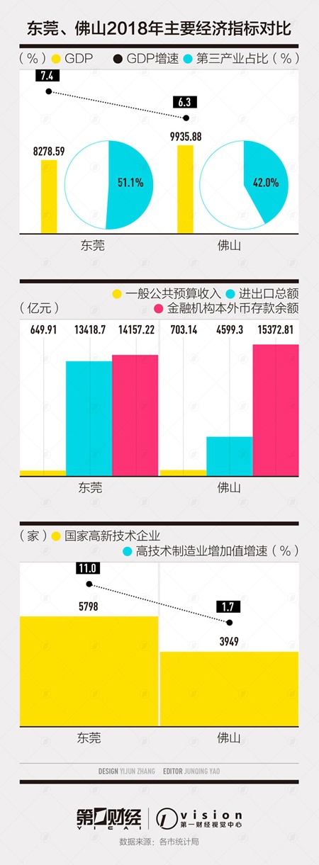 佛山市统计公报显示,2018年全市地区生产总值9935.88亿元,比上年增长6.3%。也就是说,2019年佛山迈入GDP万亿俱乐部基本已无悬念。相比之下,2018年东莞实现地区生产总值8278.59亿元,比上年增长7.4%。