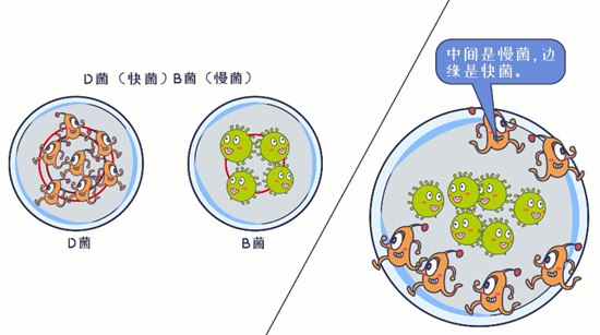 随后,科研团队将“细菌大战”的实验,扩展到3个菌群,结果形成了两大分水岭,由慢到快运动速度不同的菌群,从内而外各自占据了优势空间。