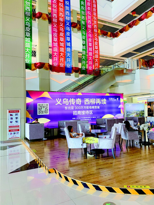 主楼中央大厅环廊上,悬挂着“祝贺西柳义乌皮草城盛大开业”等条幅。招商接待区内宽敞明亮,只见两三个慵懒的中年妇女,光脚翘到沙发椅上玩手机。相隔几步,“义乌传奇,西柳再续”的超薄灯箱广告亮眼,违和感十足。