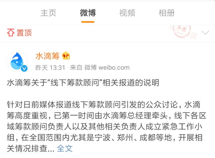 11月30日下午,水滴筹在其官方微博发声明称,水滴筹高度重视,已第一时间由水滴筹总经理牵头,线下各区域筹款顾问负责人以及其他相关负责人成立紧急工作小组,在全国范围内尤其是宁波、郑州、成都等地,开展相关情况排查。