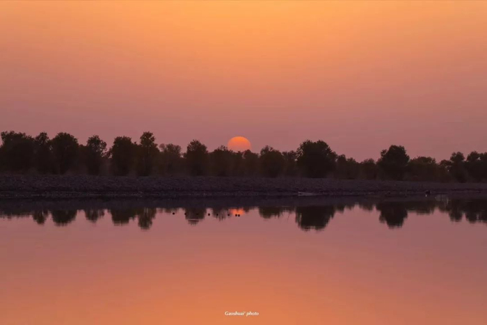 戈壁途中路过的一滩湖水和落日