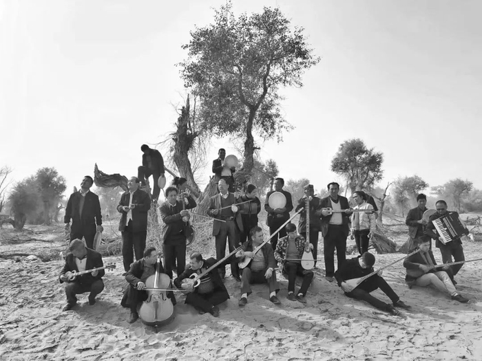 倒下的胡杨在一片荒漠里以不朽的姿态和我们对话,民间艺人带着他们的乐器,站立于天地之间,属于这片土地上的音乐和歌谣响动起来。沙丘后面冒出几个脑袋,艺人们渐渐被闻声而来的听众聚拢。王丽娜带着黑色的帽子,一身黑色卫衣和牛仔裤,举着一只巴掌大小的相机,瘦小的身影穿梭在人群中。