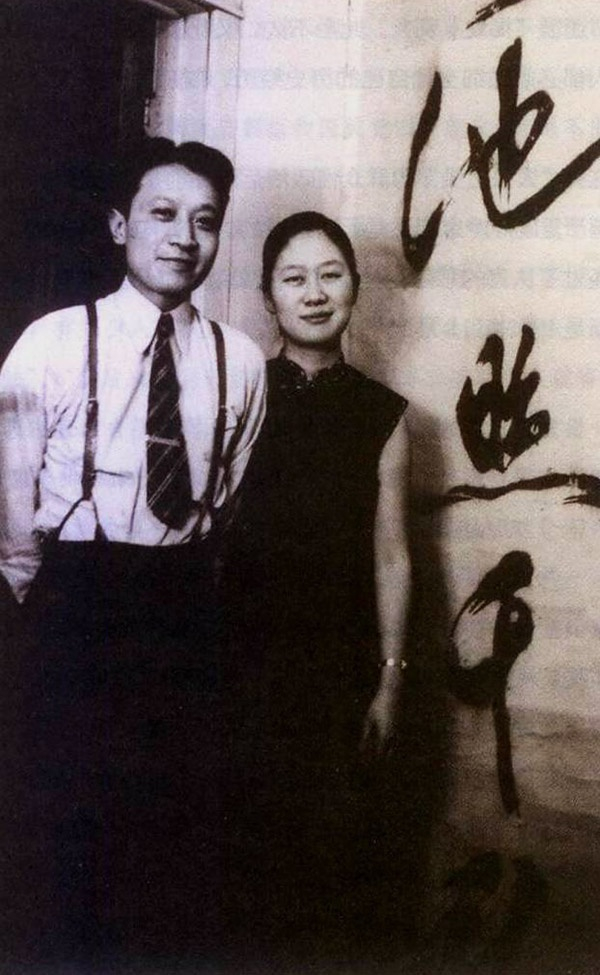 陈梦家与妻子赵萝蕤在住宅的合影,背景书法为陈梦家所藏米芾书法。