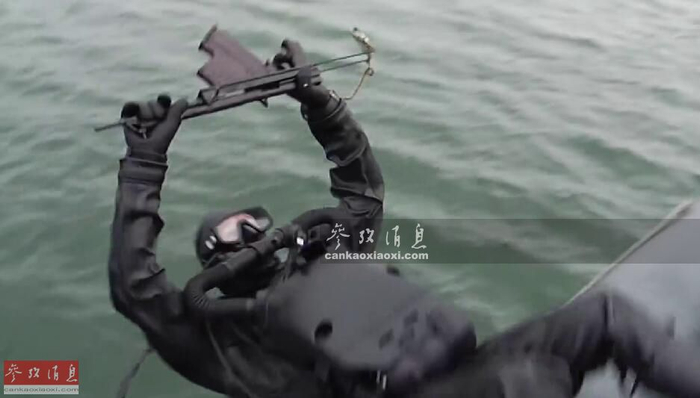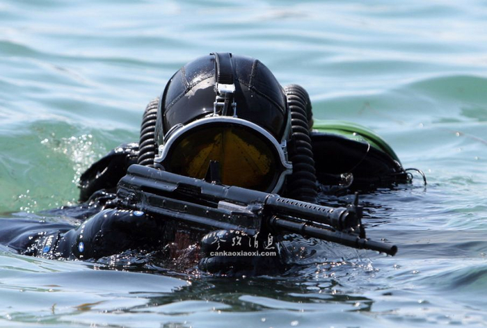 手持APS水下步枪的俄军蛙人在水中潜行。