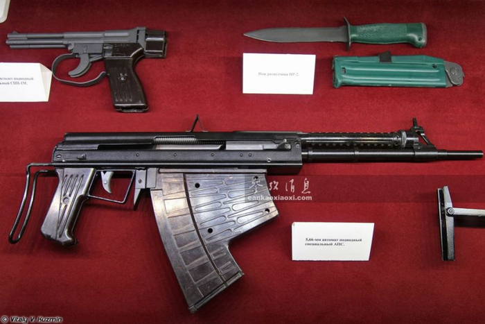 博物馆中陈列的APS水下突击步枪、SPP-1水下手枪和蛙人用水下匕首。