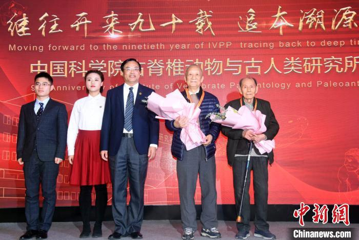 中科院古脊椎所所长邓涛研究员(中)向两位老专家代表(右一、右二)颁发“与所同行”纪念章,两位年轻学生上台献花致敬并一起合影。 孙自法 摄