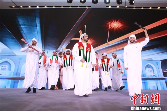图为阿联酋艺术家表演传统舞蹈Al Ayala。大使馆供图