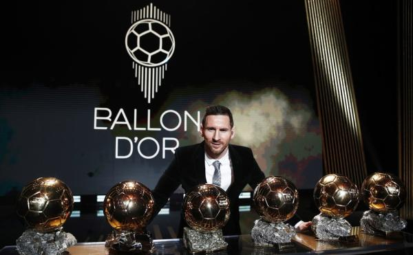 梅西和自己的6座金球奖合影。