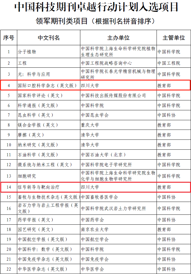 11月22日,中国科技期刊卓越行动计划办公室发布了“关于下达中国科技期刊卓越行动计划入选项目的通知”。华西口腔主办的《国际口腔科学杂志(英文版)》(International Journal of Oral Science, 以下简称IJOS)和华西医院/生物治疗国家重点实验室主办的《信号转导与靶向治疗》(Signal Transduction and Targeted Therapy,以下简称STTT)入选中国科技期刊卓越行动计划领军期刊项目,是全国5000多种科技期刊中遴选的22种领军期刊之一。这是IJOS继2013年、2016年两次获得“中国科技期刊国际影响力提升计划项目(A类项目)”后,再次获得国家级重大期刊类项目支持。《华西口腔医学杂志》入选中国科技期刊卓越行动计划梯队期刊项目。该项目在全国5000多种科技期刊中择优遴选200种(英文100种,中文100种)具备一定办刊基础和发展潜力的科技期刊,作为梯队培育目标。
