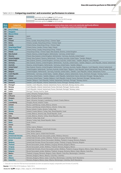 在科学素养测试中,6.8%的学生是科学领域的佼佼者,这意味着他们达到了5级或6级。B-S-J-G联合体的学生中,几乎有三分之一32% 达到了这一水平。除了与较低水平的技能相关的技能外,这些学生还可以创造性地,自主地将他们对科学的知识和有关科学的知识应用于各种情况。