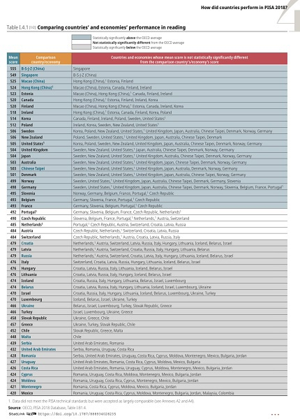 在每轮PISA中,都会对一个科目进行详细测试,约占总测试时间的一半,2018年的主要主题为阅读。值得一提是,北京、上海、江苏和浙江联合体中,成绩靠后的10%学生也显示出比OECD平均水平更好的阅读能力。“PISA测试之父”、经济合作与发展组织(OECD)教育和技能部部长Andreas Schleicher表示,虽然来自中国东部地区的四个省市远不能代表整个中国,但每个省市的规模相当于或者超过了一个典型的经合组织国家,四省市加起来的总人口超过1.8亿,而这四个中国地区的平均收入水平则低于经合组织的平均水平。