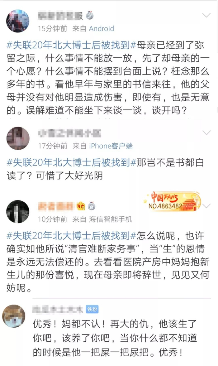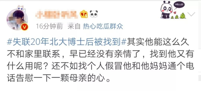 #失联20年北大博士后被找到#上了热搜,网友们也议论纷纷。