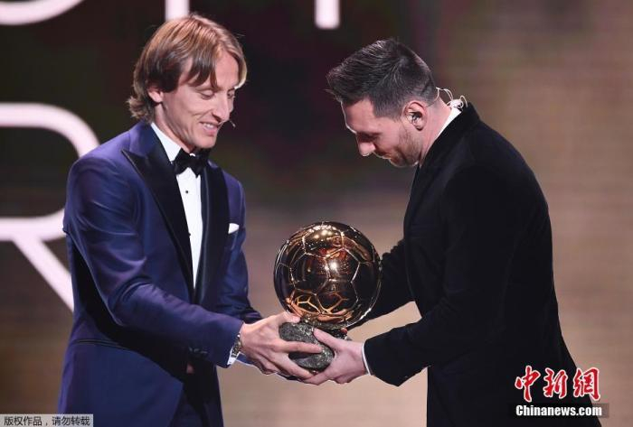 梅西和C罗是金球奖有史以来获得次数最多的球员,两人都分别拿过5个金球。自2008年起,两人开始了长达10年的“二人转”垄断,但这一态势去年被打破。2018年金球奖属于皇马的克罗地亚中场莫德里奇,C罗排名第二获得银球,巴萨的法国前锋格里兹曼排在第三,梅西无缘三甲。图为莫德里奇为梅西颁奖。