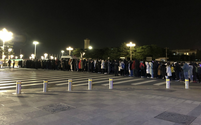 过了安检口,队伍再次停住。周边如水寂静,只有这里人声喧哗。一对情侣搂在一起,小伙笑着安抚冻得哆嗦的女朋友,“夏天看哪有冬天有教育意义是吧?”一位大哥语音指导着先一步进去的同伴,“看到我发群里的位置了吧?1和2是最好的,你赶紧去!”还有“经验人士”高谈阔论,“我觉得这里停一下,就是给你跑的机会。”